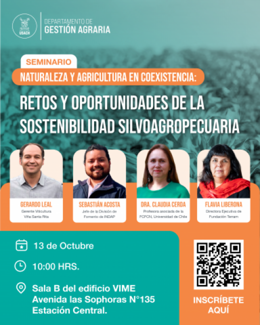 En este contexto, el Departamento de Gestión Agraria de la Facultad Tecnológica de la Universidad de Santiago de Chile, desarrolla iniciativas de investigación, asistencia técnica y cooperación con las comunidades locales en el ámbito silvoagropecuario. Una de estas iniciativas es el seminario: "Naturaleza y Agricultura en Coexistencia: Retos y Oportunidades de la Sostenibilidad Silvoagropecuaria", cuto objetivo es fomentar el diálogo entre diferentes sectores de la sociedad para promover el desarrollo de actividades silvoagropecuarias que protejan el pratrimonio natural de Chile. El evento contará con la participación de profesionales con amplia experiencia en políticas públicas, gestión y legislación, quines compartirán sus perspectivas sobre los desafíos transversales de la sostenibilidad silvoagropecuaria.
